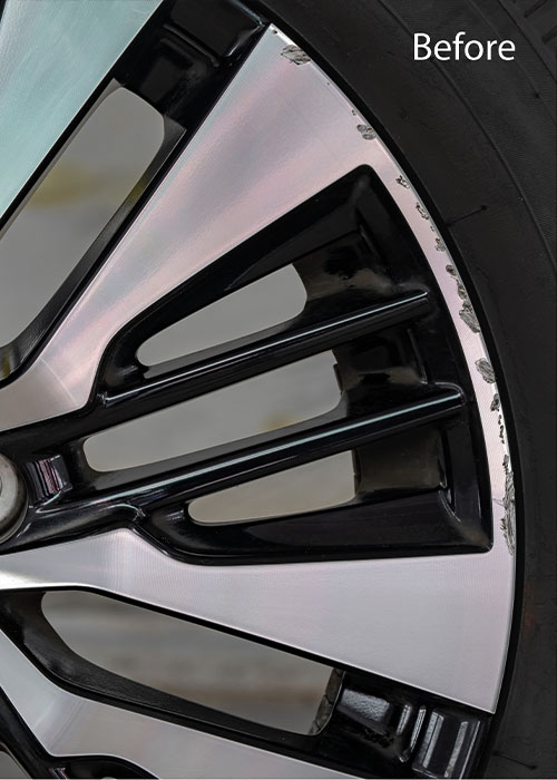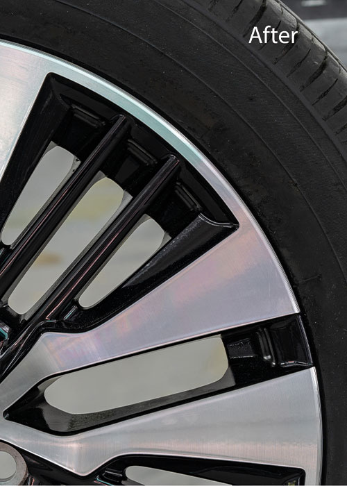 To remove diamond cut alloy wheel corrosion and damage, we can perform a precise CNC diamond cutting of the wheels, removing a thin layer of aluminium, and then apply a wet paint finish followed by a clear lacquer coat. It can be applied to the full face and lip of the wheel or combined with a base coat paint to produce custom finishes.